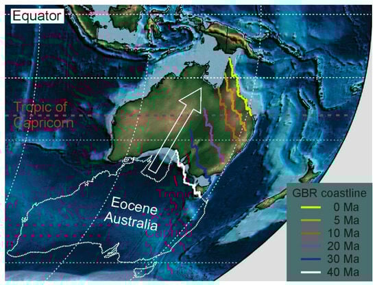Australia’s movement through time from the Eocene to Holocene on a Robinson projection. Outlines of Great Barrier Reef: 40 Ma (white), 30 (blue), 20 (purple), 10 (red), 5 (orange) on zero (yellow). Base map and movement data from C. R. Scotese [209,210].