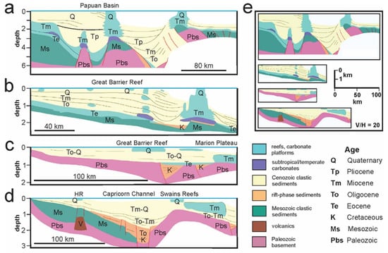 Reconstructed cross-sections based on seismic data and limited drilling across the Great Barrier Reef Province from the Papuan Basin in the north to the southern GBR; positions of sections are shown in green on Figure 9; (a) section 1; (b) section 2; (c) section 3; (d) section 4; from [201] as modified by [211]; (e) simplified versions plotted with the same scales relative to each other; vertical exaggeration: V/H = 20. Note the much thicker stratigraphy to the north owing to subsidence caused by crustal loading from sediments delivered to the back-arc basin.