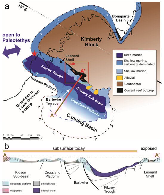 Paleogeographic reconstruction of the Devonian Great Barrier Reef (DGBR); paleolatitude for 375 ma [210]. (a) DGBR potentially borders the Kimberley land mass to the north and east to the exposed Famennian reefs in the Bonaparte Basin, and to the south along the Barbwire Terrace, where it has been penetrated in drill core, modified from [90,230,233], red star marks DGBR in seismic data [229]; transect A-A′ is shown in (b), inset (14b) is shown in a subsequent figure; (b) hypothetical transect across Leonard Shelf to south across Fitzroy Trough to the Kidson Sub-basin (after [233]).