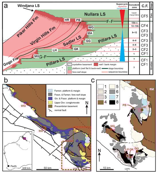 Devonian Great Barrier Reef stratigraphy and localities. (a) Simplified cross-section of Leonard Shelf stratigraphy (modified from [267,269]) with main formation names (black letters) and proposed carbonate factory distribution (C.F.); key localities are plotted at approximate stratigraphic levels: Menyous Gap—MG, Lloyd Hill—LH, Glenister Knolls—GK, Galeru Gorge—GG, Mowanbini Archipelago—MA, Windjana Gorge Classic Face—WG, Pothole Bore—PB, Horseshoe Range—HR; (b) Leonard Shelf locality map (inset 14b in Figure 13) (modified from [265] there after [89]) with localities shown in red; (c) inset map (modified from [270]), legend numbers: 1—Quaternary cover; 2—Mississippian Fairfield Group; 3—Ordovician Prices Creek Group; 4—Precambrian basement; 5—Devonian siliciclastic strata; 6—Frasnian–Famennian fore-reef slope to basin; 7—Famennian platform facies; 8—Frasnian platform facies.
