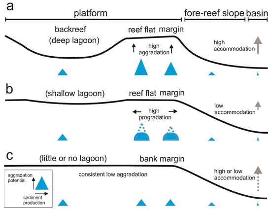 Carbonate factories are intimately related to local conditions, such as bathymetry, energy levels, oxygen and nutrients and typically define the spatial distribution and productivity of particular facies and their zonation across carbonate environments [174,336,337]. Maximum carbonate production typically occurs on reef margins facing the open ocean (Figure 15). That is also where reef framework constructors are concentrated. Where those constructors are suprastratal and adequately unified, they can support much greater aggradation than the factories in other environments leading to barrier reef morphologies and back-reef lagoons where adequate accommodation is available. The degree of aggradation also can be limited by the rate and amplitude of accommodation generation (Figure 15b). Inadequate accommodation can dampen aggradation, thus equalizing the potential across different factories. Although generalities exist in carbonate production potential between carbonate factories of different ages, their constituent members have changed significantly over time and in some cases, the aggradation potential is more even across an entire platform (Figure 15c).