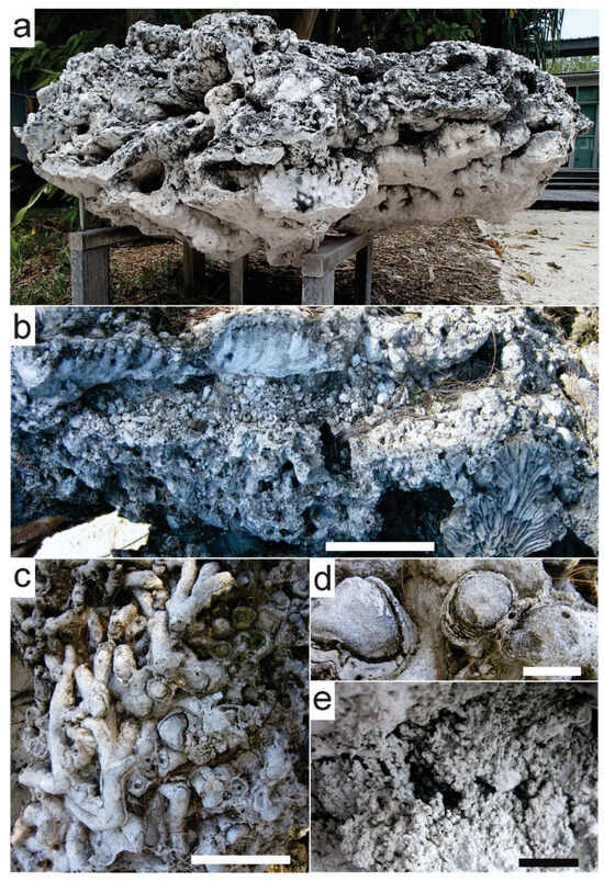 Excavated blocks of typical reef rock, leeward end, Heron Reef; (a) large block of rigid vase-shaped corymbose Acropora framework with crustose coralline algae (CCA) and cryptic thrombolites, diameter ~1.5 m; (b) platy and massive corals bound in situ with rubble, scale bar = 15 cm; (c) branching Acropora framework with abundant CCA, scale bar = 15 cm; (d) enlargement of (c) showing layers of CCA on eroding Acropora branches scale = 3 cm; (e) cryptic thrombolite (microbialite) growing cavities between corals, scale = 1 cm.