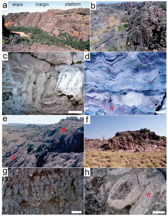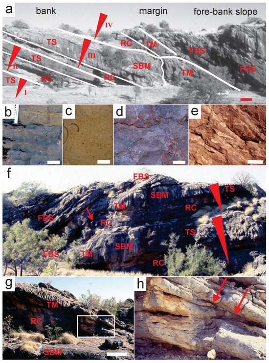 Perhaps the most comprehensive general descriptions of carbonate petrology and reef facies from the DGBR remain those of Kerans [236] and Copp [386], despite many more recent works focused on more regionally or temporally constrained parts of the complex, e.g., [265,266,270,285,387,388] and the major review by the Geological Survey of Western Australia [90]. Key members of the DGBR carbonate factory were summarized by Playford [88] and include stromatoporoid sponges [389], corals [390,391] (Figure 17), calcimicrobes [236,392], microbial biofilms (makers of stromatolites, thrombolites, many oncoids and probably ooids) [87] (Figure 18), receptaculitids, calcareous algae [392], brachiopods [393,394], crinoids, gastropods and bivalves [99,236,395] (Figure 19). Stromatolites [282,396,397] and siliceous lithistid [398] and soft sponges [236] also were significant on reef slopes and in deeper settings (Figure 19h) and encrusted broad event surfaces in the middle to late Frasnian [283]. Soft and siliceous sponges, although not carbonate producers, enhanced carbonate production by promoting carbonate precipitation through microbial metabolic processes [399], thus localizing microbialite formation as in Mississippian and Jurassic reefs [98]. Carbonate factories changed significantly through the Late Devonian, with the most drastic changes associated with the Frasnian–Famennian extinction event [84], but also the earlier end-Givetian event [70], which coincided with the end of the peak of Devonian reef growth globally [85]. In general, three major sets of organisms dominated the carbonate factories through DGBR time: Givetian–early Frasnian stromatoporoids and corals; middle–late Frasnian microbes and stromatoporoids; and Famennian microbes [90] (Figure 17 and Figure 18). However, as with the GBRP, the reef complex was extensive with complex geography and significant and abrupt changes in accommodation due to active tectonism leading to significant temporal and/or regional environmental differences in factories [236,267,400]. These major differences allow more or less distinct carbonate factories to be recognized (Figure 14). The carbonate factories specified below represent a much larger spectrum and combine some of the previously defined lithofacies and lithotopes [236] but are intended to represent the generalized temporal succession. However, difficulties in correlating shallow facies in the DGBR render differentiation of exact temporal versus spatial–geographic relationships difficult [269,271,401]. The exact relation of margin framework facies, for example, to coeval back-reef facies is hampered by incomplete exposure and subsequent erosion. Some margin facies are known primarily from debris on associated slopes, where more complete exposures may occur, e.g., [265,266,270,402].