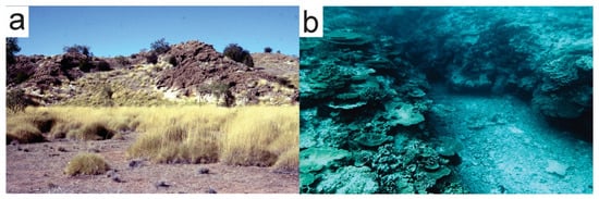 A major contributor to coral reef ESs, especially where coastal protection is concerned, is the characteristic of reef communities (including ancient reef communities that lacked corals) to be perhaps the world’s best natural engineers. These communities interact directly with local geography to modify proximal environments and construct rigid structures at sea level that directly support and benefit their constituent communities. These rigid, relief-bearing structures, defined by reef geomorphology, protect adjoining lagoons and coasts and thus uniquely support a variety of other marine and coastal ecosystems. Reef growth dynamics have been of great interest to ecologists and geologists since Darwin [24] and have been studied in a comparative sense (modern reefs as analogs for ancient reefs, and ancient reefs as analogs for the longer-term drivers of, constraints on, and anthropogenic effects on modern reef formation) since that time [25,26,27,28,29,30]. As builders, reef communities were the first life on Earth to create elevated structures large enough to be visible from space. That said, no two reefs today are exactly alike owing to differences in latitude, local climate, bathymetry, tectonic setting, basement substrate, local oceanographic settings, etc., and, when geological time is added, even marine and proximal terrestrial biological constituents and marine chemistry have changed significantly. Regardless, reefs in the ancient past commonly bear striking similarities to modern reefs in terms of geomorphology and, where studied in detail, even their local community structures and the distributions of morphological types and functional roles of organisms across different reef environments share many similarities [31,32,33,34,35,36,37,38,39].