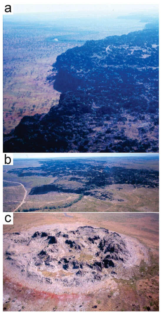 The DGBR in western Australia crops out over a length of 350 km with a width of as much as 50 km on the Lennard Shelf along the southwestern margin of the Kimberly Block, an ancient shield area of Proterozoic metamorphic and igneous rocks that make up the North Australian Craton [88] (Figure 13). However, the reef extends into the subsurface to the northwest and originally may have bordered the Kimberly Block for 1000 km turning back to the north and east to the Bonaparte Basin [88,90,228,229]. The reef also may have extended to the east and south along the edges of the Fitzroy Trough and Gregory Sub-basin and then turned west again along the shallower Crossland and Broome platforms [90] where similar Late Devonian reef facies have been recognized in seismic data and intersected in boreholes [230,231,232,233]. Hence, it may stand as one of the larger Devonian reef complexes, not the smallest of twenty [85]. Playford and others [90] provided a detailed history of study of the DGBR. Although first studied geologically in 1883 [234], the limestones were not interpreted as fossil reefs until 1924 [235]. They were investigated for their resource potential from the 1930s to 1950s culminating in major regional and integrative studies by the Geological Survey of Western Australia since the 1960s [87,88,90,236]. They are associated with minor hydrocarbon development [233,237] but host significant base metal sulfide deposits [238] and many hundreds of papers have been published on various aspects of the reefs over the last century.