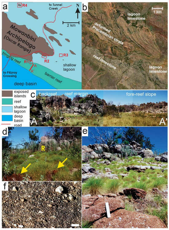 The present review is based on the literature and field work carried out on the Leonard Shelf between 1988 and 2010 and in the GBR between 1984 and 2024. The goal is to make the discussion accessible both to modern reef workers and paleontologists–geologists working on ancient reefs, but reef concepts vary widely between modern ecologists and geologists and even the definition of what constitutes a ‘reef’ or ‘reef framework’ varies between different practitioners [25,31,98,101,102,103]. Different reef semantics make better sense to different workers based on their background, experience, aims and scale of study [72,104,105]. The important thing, though, is to be clear about the semantics being used in an analysis so that the concepts can be directly compared, even if the terminology differs. For this review, a general definition is used [72,106] where reefs are defined as autochthonous structures that (1) have relief above the surrounding sea floor, (2) have adequate synsedimentary rigidity to withstand local wave action or potential wave action, and (3) were constructed by a specialized biological community that differs from that on the surrounding level (non-reef) sea floor. Although reef ecosystems today are dominated by scleractinian corals and crustose coralline algae (CCA), and corals are commonly considered the dominant and/or most significant feature of a reef, almost to the exclusion of other organisms [107], the living biology is but a thin veneer situated upon the substantial structure of the reef edifice itself. It was these massive structures that loomed up from deeper waters to provide hazards to shipping just below the ocean’s surface that first brought reefs to the attention of Western mariners (and no doubt many earlier Indigenous mariners) and then to modern science. The term ‘reef’ was most likely developed from an old Norse or German word ‘rif’, meaning a ridge or ‘Er Rif’, an Arabic term for submerged hills [102]. Using the present definition, a reef is a physical, self-supported edifice that includes both the so-called ‘framework’ and the particulate sediment that is protected behind it from wave energy (i.e., the shallow back-reef) along with the attached sediment that is gravitationally deposited on the reef slopes that helps create and maintain the relief. This definition avoids the difficult semantic task of differentiating a ‘reef core’ from the rest of the edifice, but regardless, there must be a demarcation between what is and is not part of the reef. Reef sediments transported away from the reef by currents or gravity (e.g., turbidites) to end up in different depositional settings, such as the deep sea, would not be considered part of the reef. In the case of modern linear, ‘ribbon’ reefs, reef sediments slope off the back of the windward reef margin and eventually intergrade with normal level bottom, non-reef sediments on the shelf. The demarcation could be chosen based on relief or by sediment source depending on the semantics chosen. For this paper, elevation above the level bottom is the key factor, but members of the reef-building community may intergrade continuously with those of the non-reef, level bottom community. In shore-attached platforms and fringing reefs, reef-derived sediments may grade into continental sediments at the same elevation. In that case composition would provide a necessary demarcation, but the elevation of even the continental sediments is supported by the reef rim and thus could be considered part of the overall edifice. Platform reefs are perhaps easiest to conceive, as they are elevations that are isolated on all sides by deeper waters, but every reef and reef system is unique in some way.