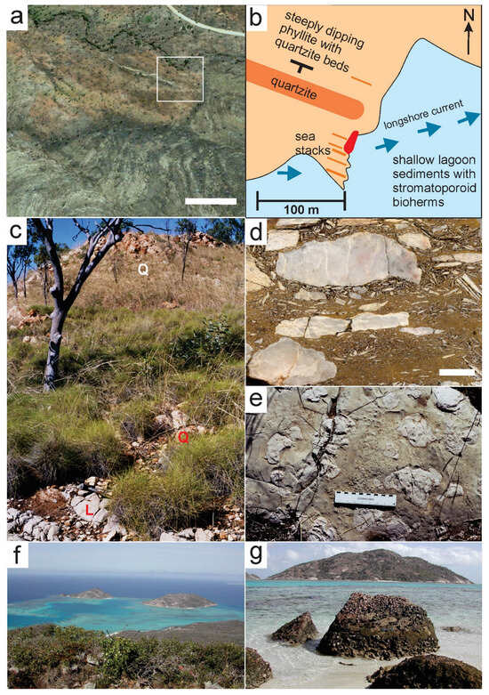 The Fitzroy Trough was an active, extensional intracratonic basin during the Devonian and now forms the northernmost region of the broader Canning Basin [239,240]. The northern part of the Late Devonian, western Australia occupied the southern tropics located in the northeastern part of Pangea, thus representing similar latitudes to the current GBRP [210] (Figure 1b). However, the orientation of the exposed portion of the reef complex on the Lennard Shelf was near parallel to latitude, so represented a tighter latitudinal range at a given time than does the GBRP. Although a variety of rifted tectonic terranes occurred to the north and west of Australia at the time, faunal evidence suggests that the Canning Basin was open to Tethyan Ocean circulation to the west [241], but the basin was partially restricted [233] (Figure 13). The eastern coast of northern Australia also occupied the tropics during the Devonian and hosted shallow carbonate environments, but they were mostly Early and early Middle Devonian in age [85,242,243]. Givetian (upper Middle Devonian) shelf limestones occur in Queensland in the Broken River [243] and small patch reefs with corals and stromatoporoids occur in the Fanning River [69,244,245] groups, but major reef complexes similar to those in the Caning Basin have not been recognized [242,246]. However, stromatoporoid–coral buildups to 30 m thick and 2 km long occur in the lower Devonian part of the Broken River Group [247]. Older Lower Devonian limestones near Chillagoe to the north also contain stromatoporoids and corals, but no major reef complexes have been described [248]. Limestones were particularly rare in Queensland during the Frasnian and Famennian, the main age of the DGBR, and reefs of that age are unknown there [84].