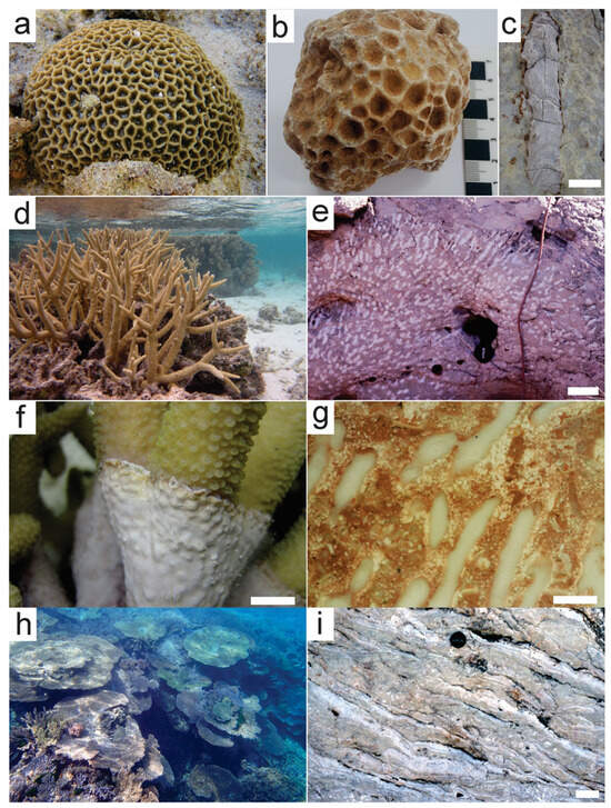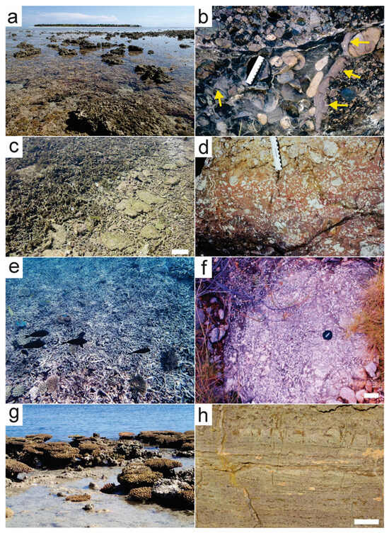 Key modern skeletal reef carbonate producers and examples of main functional guilds [31]. (a–f) Key carbonate producers in the Great Barrier Reef (GBR), blue outline. (a) Scleractinian corals, key constructor guild; (b) crustose coralline algae (CCA), dominant binder guild, scale = 2 cm; (c) cryptic microbialite, secondary binder guild, scale = 1 cm; (d) Halimeda (calcareous green alga), baffling guild along with branching corals and non-calcareous algae, scale = 1 cm; (e) large benthic foraminifers—LBFs (blue arrows Marginopora, white arrow Calcarina) on algal turf with CCA, dweller guild, but carbonate producer, scale = 5 mm; (f) mollusk (live Tridacna), mainly dweller guild but carbonate producer; (g–m) bioerosion products and members of the destroyer guild, red outline; (g) computer-aided tomography scan of live collected Isopora coral showing bivalve borings (Gastrochaenolites ichnotaxon)—such borings weaken corals so that they break easier to become coral rubble (i.e., shingle), scale = 2 cm; (h) coral shingle accumulated on the rubble subzone of the reef margin; (i) enlargement of branching coral rubble from rubble subzone, scale = 15 cm; (j) bivalve occupying boring in heavily bored coral skeleton, scale = 1 cm; (k) parrot fish (Scaridae), important raspers in the GBR; (l) bite marks where filamentous algae have been removed from beachrock by parrot fish; (m) Spondylus bivalve shell riddled with boring sponge galleries, scale = 2 cm; (n) Crown of Thorns Starfish (COTS—Acanthaster planci), a significant corallivore on modern reefs, but it does not actually erode coral skeleton it just kills areas of coral; (o,p) example dweller guild members (yellow outline) that represent high biodiversity on reefs, but do not make carbonate nor destroy it; their roles in the trophic structure, such as fish grazing on fleshy algae can still be critical to reef growth, but they may leave no trace in ancient reefs; (o) Canthigaster (Blacksaddle Toby Fish); (p) Hexabranchus sanguineus nudibranch (Spanish Dancer shell-less sea slug), scale = ~3 cm. All photos from Heron Reef, except (m) from One Tree Reef, southern GBR.