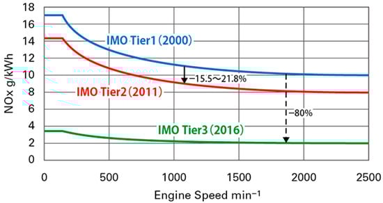 NOx emissions are a significant environmental concern in the maritime industry due to their contribution to air pollution and the adverse health effects they cause. Reducing NOx emissions has become a priority under international regulations such as the IMO Tier standards, which mandate stringent vessel limits [28]. The transition to new fuels plays an essential role in reducing NOx emissions. Fuels such as hydrogen, ammonia, and some biofuels offer cleaner combustion profiles, often resulting in lower NOx output compared to traditional marine diesel oil (MDO) or heavy fuel oil (HFO) [29,30].