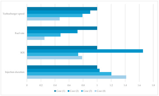 After defining the values of Chen-Flynn correlation, the performance of the engine model is optimized at four representative operating points defined by the NOx Technical Code, as outlined in Table 2. The optimization framework is capable of predicting the optimal values for key control parameters, namely turbocharger speed, fuel injection rate, SOI, and injection duration, with the primary objective of maximizing the AFR, while ensuring compliance with thermodynamic constraints and maintaining combustion stability, as described by Tadros [56]. The optimization results are illustrated in Figure 4, presented in a normalized form relative to Case (1), which corresponds to the engine’s rated operating condition. As observed, both turbocharger speed and fuel injection rate decrease with the reduction in engine load. A significant shift in SOI is also evident, with values ranging between −1.5 and −3.6 degree before top dead center (BTDC), indicating a tendency to advance injection timing at the different loads before the piston reaches the TDC. In contrast, injection duration shows an increasing trend as engine load decreases, reflecting the need for longer fuel delivery periods to sustain combustion under reduced thermal input conditions. The variation in values along the different load points suggests an active role of air and fuel management strategies in improving the AFR, thus the combustion and pressure behavior change inside the cylinder, reducing the exhaust emissions.