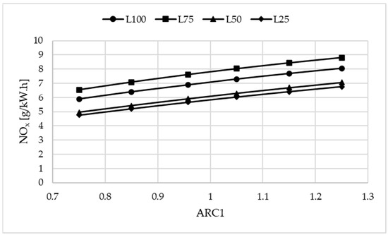 Variation in NOx emissions with different values of ARC1 at various engine load conditions, with AERC1 held constant.