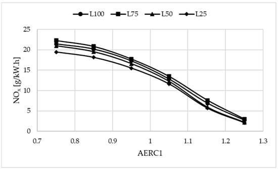 Variation of NOx emissions with different values of AERC1 at various engine load conditions, with ARC1 held constant.