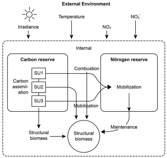Carbon assimilation is modeled using a three-stage synthesizing unit (SU) framework adapted from Venolia et al. [23], comprising SU1 (light absorption), SU2 (excitation relaxation), and SU3 (CO2 fixation). The model assumes the availability of dissolved CO2 in seawater, including uptake from bicarbonate (HCO3−), which is known to support photosynthetic carbon fixation in macroalgae under high-pH conditions [26].