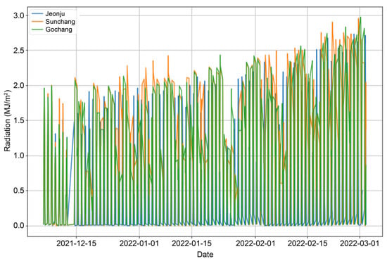 Time series of solar radiation (MJ m−2) measured at Jeonju, Sunchang, and Gochang from December 2021 to March 2022.