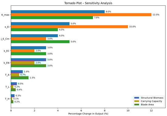 Figure 11 presents the results as a tornado plot, illustrating the normalized average response magnitude for each parameter across all outputs. Among the tested parameters, the maximum carrying capacity (Kmax) exhibited the highest sensitivity, producing up to 12% variation in K and 8% in . The recycling efficiency () also significantly influenced the carrying capacity, emphasizing the role of rejected flux reallocation under nutrient-limited conditions.