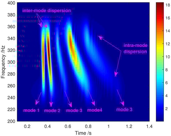 Due to the strongly nonlinear change of energy propagation, the transmission delay varies along with modal orders and frequency components naturally. Therefore, the transmitting broadband signal is seriously distorted. As an example, a 0.01 s Continuous Wave (CW) signal transmitted through a non-noisy typical shallow water channel is analyzed by the Short-Time Fourier Transform (STFT) in Figure 1. According to the figure, we can see that the received signal has the multi-mode components. Besides, the higher order modes exhibit a tilt phenomenon in the time-frequency domain, which indicates the waveform is expanded to times of the initial pulse width 0.01 s. These two characteristics are defined as the effect of inter-mode and intra-mode dispersion, respectively []. They are observed because different modes and frequencies undergo different delays. As the propagation range increases, the accumulated delay difference will cause waveform separation and broadening.