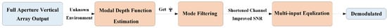 The receiver structure is shown in Figure 2, which mainly consists of three steps: modal depth function estimation, mode filtering, and multi-input equalization. Mode filtering is the core of the processing scheme, and it is suitable for continuous communication signals. By constructing an appropriate mode filtering matrix, the filtered signal is only affected by a single channel mode, which significantly reduces the channel delay spread and improves the SNR, thus showing obvious benefit for the performance of equalization processing. The mode filtering matrix can be obtained by the modal depth functions. When the environmental information is fully known, it can be simulated by a the numerical simulation program, such as Kraken []. However, in practical applications, model mismatch or inaccurate environmental parameters often result in significant errors, affecting the effectiveness of mode filtering. To avoid this problem, it is necessary to estimate the modal depth function from the acoustic field data without any a prior information. In the equalization part, for those transmitted communication signals that are only affected by single channel mode, a less complicated single input equalizer can be used for demodulation because of the reduced channel spread. For those symbols that are only affected by low order channel modes, due to the insignificant intra-mode dispersion, they can be observed as the signal transmitted in the Additive White Gaussian Noise(AWGN) channel. In the case of high SNR, symbols may be directly recovered to obtain the transmitted information. When the SNR is low, there are also several suitable techniques that can be used to minimize decision errors. For high order modes whose intra-mode dispersion cannot be ignored, a less complicated equalizer can also be used to demodulate the signal because of the reduced channel spread. Furthermore, to utilize all the received energy carried by the multiple modes and improve the processing gain of long range communication systems, a multi-input equalizer is also under consideration.