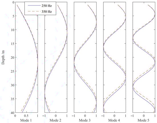 As a result, an appropriate narrowband mode filter can be built based on the input data properties and output accuracy. However, the low frequency communication signal is often modeled as broadband signal. In this case, the variation of as well as mode amplitude with frequency cannot be ignored. The modal depth function of the first 5 modes at frequencies of 250 Hz and 350 Hz is shown in Figure 3. The results indicate that even in an ideal channel environment, the curves of different frequencies still vary. As the signal bandwidth increases, the difference will become significant. In real environments, due to factors such as wind speed, water flow, internal waves, and others, the frequency dependence of the modal depth function will become more obvious. Therefore, mode filters under the narrowband assumption will lose some effect. One possible solution is to divide the broadband signal into several frequency intervals and apply the narrowband filter []. To achieve a compromise on the time-frequency resolution, the STFT idea, together with low-pass filters, is used to separate the input signals in the time and frequency domains, then send them to a mode filter to estimate the mode amplitude of each mode. The output sequence can be regarded as a set of windowed Fourier transform results. The structure of broadband signal mode filtering is explained in Figure 4.
