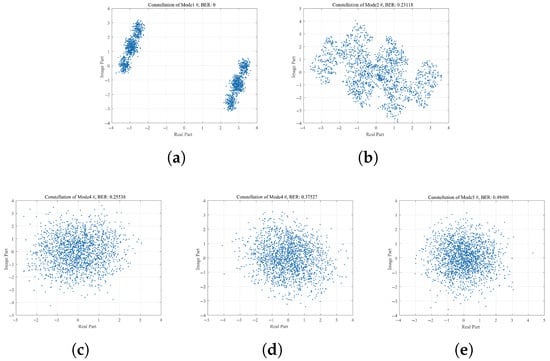 Constellation plots after mode filtering. (a) Mode 1. (b) Mode 2. (c) Mode 3. (d) Mode 4. (e) Mode 5.