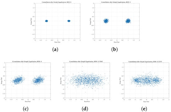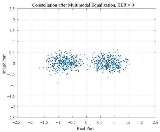 At this time, the performance is a little improved, and the BER was 0.049 and 0.178, respectively. For the symbols that suffer from the 1st channel mode, due to the weak intra-modal dispersion, equalization can achieve lower BER. However, symbols from the 2nd channel mode cannot be successfully demodulated due to severe dispersion and low SNR. The constellation plot by the proposed multi-mode joint equalization is shown in Figure 19. It indicates that the constellation after multi-mode processing becomes more gathered, and all symbols can be correctly determined. Comparing with the results in Figure 18, the gathered pattern shows improved output SNR. This result proves that multi-mode joint equalization has better performance than single mode equalization, and can achieve error-free communication even when the received SNR is not sufficient.