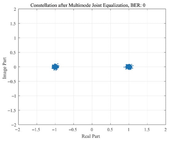 Furthermore, to fully utilize the information carried by all modes, we use the multi-mode joint equalizer in Figure 4 to process the filtered sequences. The length of the feed-forward and feedback filters is the same as that in Figure 10, and RLS also obtains the coefficients. The phase is adjusted by a second-order digital phase-locked loop []. The constellation is shown in Figure 11. By comparing with the results in Figure 9 and Figure 10, it can be found that the constellation is centralized, which means the output SNR is significantly increased. The corresponding BER is 0. This sufficiently demonstrates the superior advantages of multi-modal joint equalization processing.