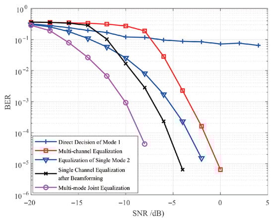Finally, to verity the effectiveness of our proposed multi-mode joint equalization scheme in low frequency shallow water environment, we present the comparisons with single channel equalization based on beamforming and multichannel equalization. The simulation parameters remain unchanged, and the Monte-Carlo times are 500. After modal processing, symbols influenced only by the 1st channel mode are directly decided, those only influenced by the 2nd mode are equalized by a DFE individually, and those influenced by modes 1–4 are jointly equalized. The resulting BER curves are shown in Figure 12.