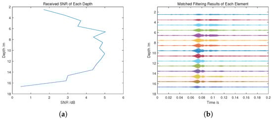 Received signal distribution versus depth. (a) SNR. (b) Matched filtering results (A rough estimation of channel impulse response).