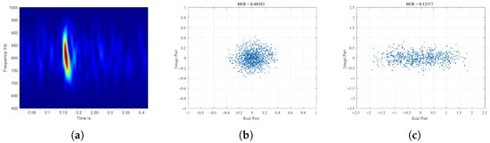 Due to the mode energy and noise distributions in the vertical direction, the received SNR of each array element varies with depth. From Figure 13a, it can be seen that the highest SNR is received at around the depth of 11 m, which is about 5 dB higher than the bottom array element. The average received SNR is about 3.72 dB. For a single carrier communication system, this value is relatively low, which will bring significant difficulties to recover the transmitted information. From Figure 13b, we can see that at a distance of 6.4 km, the acoustic field contains 2 effective modes, located near 0.07 s and 0.1 s. The amplitude of the 2nd mode varies with depth and reaches a minimum amplitude near a depth of 10.6 m. Therefore, the received signal from the 8th element may only contain the 1st mode, as shown in Figure 14a. From the time-frequency plot, we can find that the 1st mode suffers from obvious intra-mode dispersion. We make a direct decision based on the received symbols, and the constellation plot is shown in Figure 14b. The corresponding BER is 0.49. The result indicates that although the channel seems simple, the communication signal was significantly distorted. Besides, they are also greatly influenced by noise since the received SNR is 4.71 dB. Both of the channel effects make it difficult to recover the transmitted information. Figure 14b shows the constellation plot after equalization by a fractionally spaced adaptive DFE with 300 training symbols. The length of the feed-forward and feedback filter is carefully selected to get a good result while the final BER is 0.12. It seems that the commonly used adaptive equalization method can suppress channel distortion to some degree, but the performance is limited due to the low input SNR.