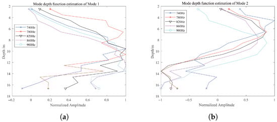 Since the large bandwidth of communication signals, we still adopt the broadband mode filtering here. Therefore, the whole bandwidth is divided into 5 subbands when estimating the modal depth function of the two effective modes. The estimated results at frequencies of 740 Hz, 780 Hz, 820 Hz, 860 Hz, and 900 Hz are shown in Figure 15.
