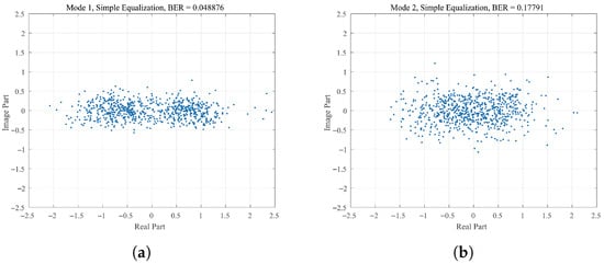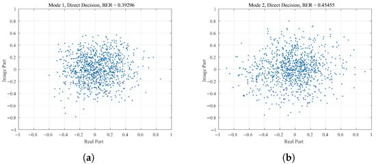 It can be seen that the symbol constellations are scattered seriously, and the BERs are 0.39 and 0.45, respectively, which cannot recover the transmitted information. This result is different from that in Figure 9 where the 1st mode can directly decide the symbol phase. This may be because the channel mode in this case spans several symbol intervals due to intra-mode dispersion and high symbol rate. Besides, the left noise interference is also severe. Utilizing the same adaptive DFE as Figure 14b to process the filtered symbols, the constellation plots are shown in Figure 18.