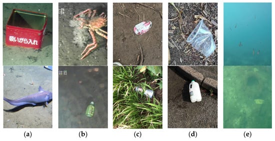 The J-EDI (JAMSTEC E-Library of Deep Sea Images) dataset will be mentioned a few times within this section. It is a part of the JAMSTEC (Japan Agency for Marine-Earth Science and Technology, Yokosuka, Japan) data collection and is popular in marine footage-based studies, as so far it has been the most comprehensive open-access collection of sea debris and biodiversity footage underwater []. These deep-sea photos and videos are taken from a submarine off the Japanese coast under varying conditions. However, the downside to this database is that it is available for multiple uses rather than specifically for machine learning. Therefore, there is a lot of data cleaning—some images or footage contain parts of the ROV system in place, the quality is not always to a computer vision quality standard, and the data needs to be labeled appropriately. Due to the depth, the images are low in color and have a beam of light from the ROV; additionally, any biodiversity is benthic. Regardless, JAMSTEC is a popular choice for obtaining underwater footage. It is also worth mentioning that there is another database called JeDI, “The Jellyfish Database Initiative”, which could be easily confused with J-EDI, “JAMSTEC E-library of Deep-Sea Images”; JeDI is used for tracking jellyfish populations [].