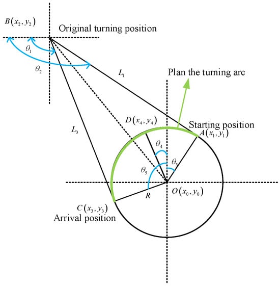 In Figure 1, the original path is , and is the path planned by the equal-radius circular-arc steering maneuver method. When the ship travels to point A, this method will calculate the optimal turning radius. The specific calculation is shown in Equation (1). It is clear from Figure 1 that the planned path sails a shorter distance than the original path , further reducing the voyage time. Meanwhile, the ship can change its course along a smoother path, ensuring that the ship maintains a stable trajectory during the turning process and preventing overshoot caused by an excessive radius. However, due to the large inertia and long-time lag of large ships, a smaller radius may result in too sharp a steering for them.