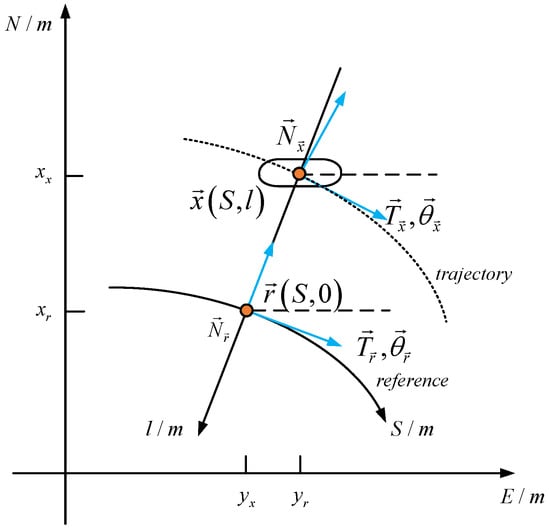 Here, the axis travels along the route with an increasing axis and is perpendicular to the reference curve at all times. Equation (2) shows the mapping relationship between the Cartesian coordinate system and the Freightliner coordinates, where stands for variables in Cartesian coordinates; stands for variables in Freightliner coordinates; and represents the curvature of its trajectory. Equation (3) is the inverse transformation between the two coordinate systems.