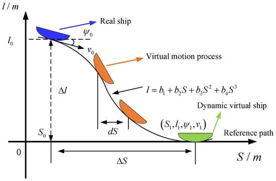 This method considers the longitudinal and transverse movements relative to time, respectively, based on the Freiner coordinates, and it calculates the position information of the virtual ship according to the state of the actual ship, then plans the path to be tracked. As shown in Equation (4), the path of the planned virtual ship is , and it is described using a cubic polynomial.