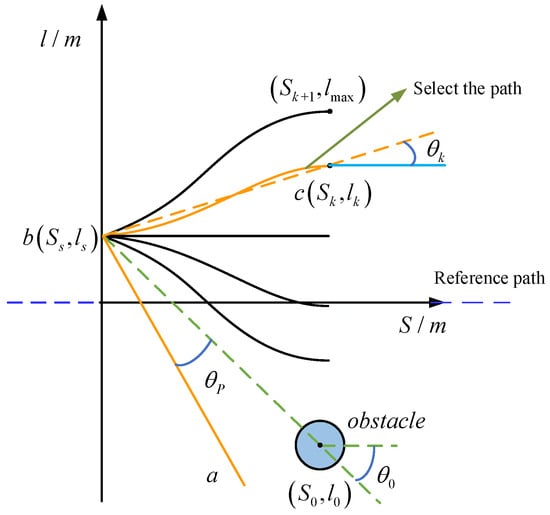 The blue circle in Figure 4 represents obstacles, and is the planning direction of the synthesized velocity. When the ship travels to the position, the obstacle enters into the capture distance. The system will generate five path branches based on the obstacles, and then we select the path with the lowest cost as the optimal obstacle avoidance path based on the established performance metrics.