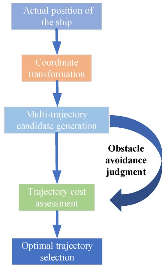 The entire control process revolves around the trajectory tracking and collision avoidance of a ship. Initially, the actual position of the ship is acquired and subjected to coordinate transformation, providing a unified reference for subsequent computations. Based on the position information, multiple candidate navigation trajectories are generated, and a closed loop for obstacle collision-avoidance judgment is introduced simultaneously. If a trajectory is deemed unsafe, it will be regenerated to give priority to collision avoidance and ensure the basic safety of navigation. Subsequently, from the perspectives of navigation efficiency, control cost, and path-tracking accuracy, a cost assessment is conducted on the safe trajectories. Ultimately, in accordance with the assessment results, the trajectory with the optimal comprehensive performance is selected as the navigation instruction for the actual execution of the ship, enabling the ship to navigate safely and efficiently in complex environments. The entire control process is illustrated in Figure 5.