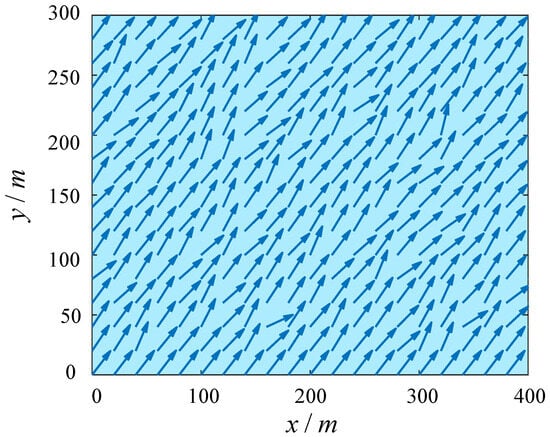 To verify the anti-interference of the control method proposed, level 6 wind and wave disturbances are included in the simulation experiments. Figure 6 and Figure 7 are the simulation result diagrams of the wind field and wave field introduced in this experiment [21]. The direction of the blue arrow in Figure 6 indicates the flow direction of the wind. The parameters of this wind farm are set as follows: average wind speed 10 m/s, wind direction angle 30°. The wave field parameters are as follows: The effective wave height is approximately 2.5 m, the wave period is between 6 and 10 s, and the wave direction is random. The wave spectrum adopts the Pierson–Moskowitz model, in which the peak frequency of the spectrum is 0.1 Hz and the spectrum width is 0.05 Hz.