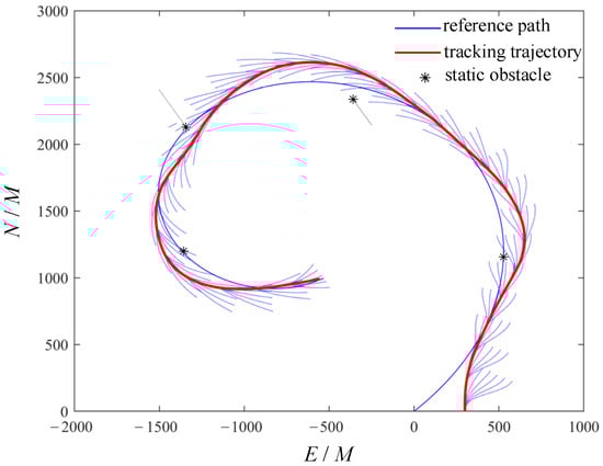 In this experiment, a reference path is generated using the cubic spiral curve function, and static obstacles as well as dynamic obstacles are added to the path to further validate the algorithm’s obstacle avoidance function in complex environments. The obstacle avoidance effect is shown in Figure 8. The star points represent the obstacles, and the star points with moving trajectories represent the dynamic obstacles. The position information of the four obstacles a, b, c, and d in sequence is [810, 2516, 0, 0], [−700, 3800, 0.75, 120 * pi/180], [−2500, 4000, 0.4300 * pi/180], and [−2163, 2000, 0, 0]. The first two elements represent the initial horizontal and vertical coordinates of the obstacle, and the last two elements represent the speed and direction of the obstacle. The blue line represents the original planned route, the red represents the tracking trajectory, and the dashed lines represent the planned path branches. This experiment was set up with a ship speed of 13 knots and a sampling rate of 1 Hz.