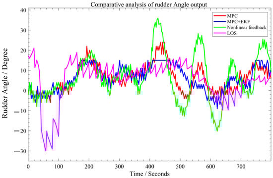 As shown in Figure 9, the rudder angle output of the algorithm proposed in this paper is plotted when performing trajectory tracking as well as obstacle avoidance tasks, where the red line represents the rudder angle output value of the original MPC algorithm, the green line represents the rudder angle output value of the nonlinear feedback control algorithm, pink represents the rudder angle output graph of the Line of-Sight method, and the blue line represents the rudder angle output value of the improved MPC. It can be clearly seen from the above figure that the improved model predictive control algorithm, compared with the other two algorithms, not only accurately completes the track tracking and obstacle avoidance tasks but also further reduces the motion amplitude of the ship model, avoiding problems such as energy loss and mechanical wear caused by an excessive output rudder angle. Table 3 shows a comparison of rudder angle outputs between the original MPC algorithm and the improved MPC algorithm under sea conditions of level 6. Compared with the nonlinear feedback control algorithm, the improved MPC algorithm reduces the maximum rudder angle output value by 58%, the integral absolute error by 34%, and the root mean square error value by 36%. Compared with the Line-of-Sight (LOS) algorithm, the improved MPC algorithm still has a better control performance. The maximum rudder angle output value was reduced by 32%, the integral absolute error was reduced by 45%, and the root mean square error was reduced by 48%. Compared with the original MPC algorithm, the improved MPC algorithm reduces the maximum rudder angle output value by 58%, the integral absolute error by 46%, and the root mean square error value by 46%. Thus, the algorithm suggested in this paper can ensure that the ship accurately performs the trajectory tracking and obstacle avoidance tasks under adverse sea conditions, as well as further reduce mechanical wear and tear.