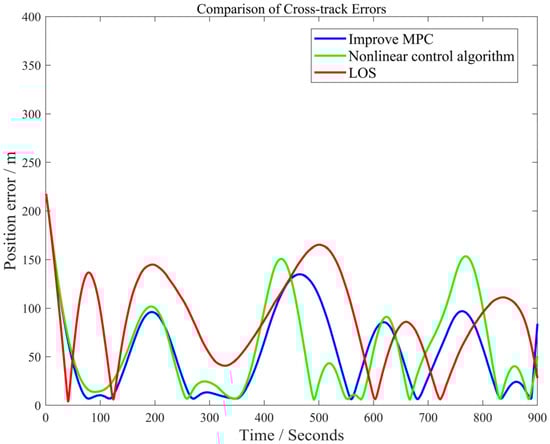 As can be seen from Figure 10, compared with the nonlinear control algorithm and the LOS algorithm, the position error under the improved MPC control law is smaller and can effectively track the reference path. Meanwhile, the improved MPC control law has a relatively fast convergence speed, which can respond promptly and adjust the control input to reduce offset.