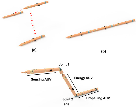 In addition, studies by Zhang [24] and Kang [25] have demonstrated that a tandem layout is an effective configuration to reduce the resistance of a group of multiple AUVs, as shown in Figure 1b. This configuration is particularly advantageous when a task-specific AUV lacks sufficient energy to reach the target location. By forming a serial robotic assembly, auxiliary AUVs can propel the mission unit using their own energy reserves. Once the destination is reached, the task-oriented AUV detaches to complete its mission, thereby overcoming the limitations imposed by the limited energy capacity of a single AUV. Furthermore, when the task-specific AUV is replaced by a payload, the RAU robot can also be regarded as an alternative to traditional payload deployment platforms [26].