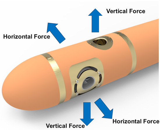 Each AUV, serving as a fundamental structural unit, is equipped with channel thrusters that provide lateral thrust for maneuvering [27]. In the standalone state, the AUV can independently adjust its horizontal and vertical positions. After docking, these thrusters act as substitutes for the motor that drives the joint in traditional USMs, enabling the control of relative positions between connected AUVs. The configuration of the channel thrusters is shown in Figure 2. Since the basic AUV has already been developed and validated experimentally [15], this paper focuses primarily on the design of the connecting joint.