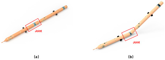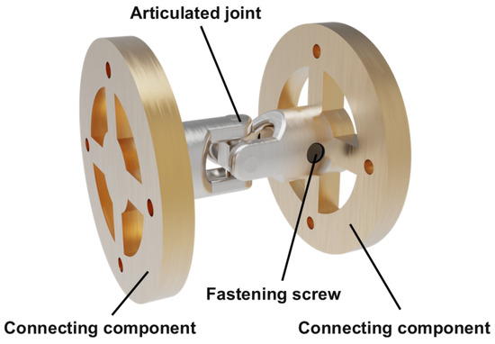 The joint is designed to provide two passive DOFs, pitch and yaw, which can be constrained by the drive module demonstrated in Figure 4. As shown in Figure 5, the main body of the articulated joint adopts a universal joint structure. This is composed of a pair of standard hinges arranged orthogonally at . Both ends of the universal joint are fixed to the connecting components using fastening screws.