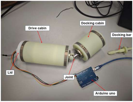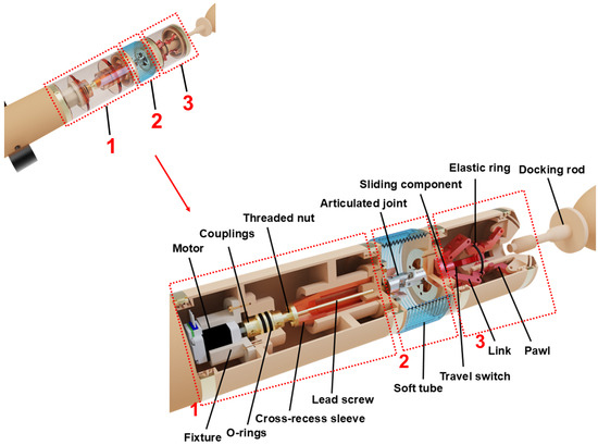 The docking rod is mounted at the front of another AUV. Docking is achieved by inserting the rod into the docking module, where it is fixed by an internal mechanism. When the RAU robot changes to USM mode, the motor inside the drive module is used to unlock the DOFs of the articulated joint. The same motor is also used to release the locking mechanism within the docking module, allowing for the separation of the individual vehicles. The internal structure of the connecting joint is shown in Figure 4.