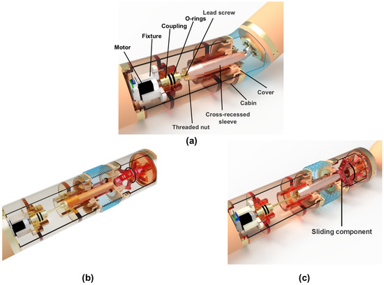 Initially, the cross-recessed sleeve is flush with one hinge of the universal joint, keeping the articulated joint in an unconstrained state, as shown in Figure 6a. When AUVs are docked or operated in straight-line mode, the cross-recessed sleeve extends outward fully through the universal joint and reaches the target position, acting as a constraint to restrict the DOFs of the joint, as shown in Figure 6b. Reversing the motor could retract the sleeve to its initial position, thus reactivating the DOFs of the joint. During separation, the sleeve extends further into the docking module to push the internal sliding component, which serves as an unlocking mechanism to release the docking rod, as shown in Figure 6c.