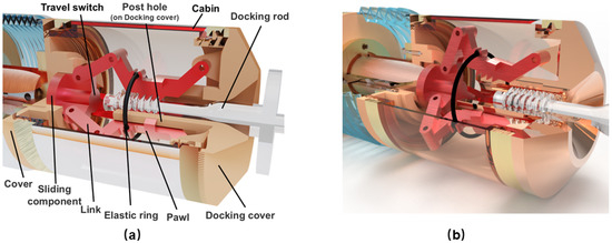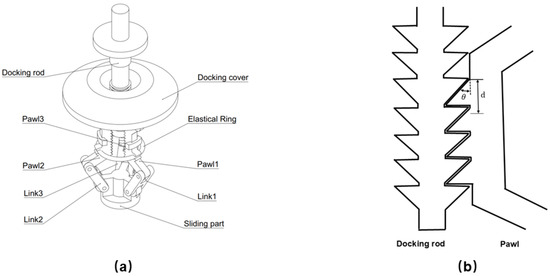 The docking module is designed to achieve both automatic locking and separation. In this design, a pawl-and-ratchet mechanism is employed to achieve automatic locking during the docking process. Three pawls are evenly distributed within the docking module, with each pawl having multiple ratchet teeth. One end of each pawl is connected to the docking cover while the other end to a sliding component by a link. The sliding component can move along a guide slot on the cover. In addition, the outside of the pawl features an annular groove. Three pawls are pulled inward by an elastic ring seated within the groove, causing them to fit tightly against the post hole on the docking cover. Once the docking rod is inserted, it passes through the post hole and engages with the ratchet teeth of the pawls, thus completing the automatic locking process, as illustrated in Figure 7a. If the docking process is successful, the rod will change the state of the travel switch on the sliding component.