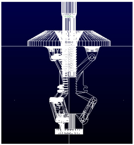 A dynamic model of the docking process was established in Adams [28], as shown in Figure 9. All components were modeled as rigid bodies with appropriate constraints. Contact forces were applied between the docking rod and each pawl. To simplify the model, the restoring force exerted by the elastic ring on the pawls was approximated as a constant, equal to the force generated when the pawls reach their maximum opening angle. The Impact function was employed to simulate three-dimensional contact and compute the resulting impact forces. It imitates the interaction as a nonlinear equivalent spring–damper system using a collision-based algorithm grounded in Hertz contact theory. The total contact force comprises two components: an elastic force due to the compression and penetration between the objects, and a damping force arising from their relative motion. The governing equation is given as follows: