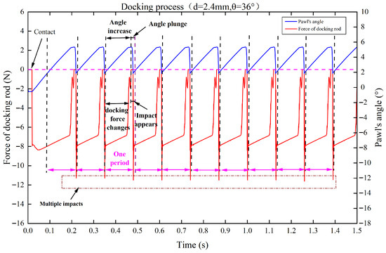 The performance of the docking is primarily characterized by the magnitude and frequency of impact forces acting on the docking rod. A dynamic simulation was conducted using a representative combination of parameters of and mm. A diagram of the impact force on the docking rod is illustrated in Figure 10. The simulation results indicate that the docking rod experienced multiple impacts during the docking process. Correspondingly, the opening angle of the pawls exhibits repeated increases followed by sharp decreases, revealing a cyclic pattern of engagement and release. A detailed analysis of this behavior is presented below: