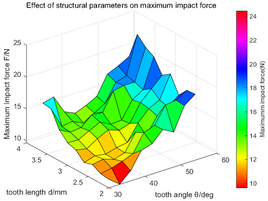 With all other ratchet tooth parameters kept constant, 81 combinations of parameters were entered into the simulation model to evaluate the corresponding impact forces on the docking rod. The simulation results were compiled, and the maximum impact forces for each combination are presented in Figure 11. The minimum impact force occurs at mm and .
