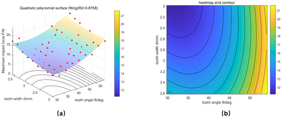 To investigate the influence of the two structural parameters on the maximum impact force, quadratic surface fitting was performed based on the simulation results. The fitted surface is shown in Figure 12, with a determination coefficient of , indicating a good level of fit. The corresponding contour map shows that the maximum impact force on the docking rod generally increases along the parameter path from to . The minimum peak impact force occurs near the combination of .